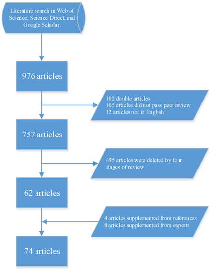 Considering the loose search strategy for the literature in the previous phase and the duplication of data between different databases, this phase also needed to set relevant exclusion criteria for the literature that did not belong to the scope of this study. Firstly, duplicate literature was undoubtedly removed in the first instance. Secondly, studies that did not pass peer review were excluded according to the usual practice of the systematic review of studies in the current state of the literature [16,34,37]. This means that book chapters, conference papers, book reviews, and editorials will be excluded from the studies reviewed in this study. Finally, given that most of the studies were written in English, fewer studies were published in other languages (e.g., French and Greek), and the threshold for learning other languages was too high, all articles not written in English were excluded. This method also used for studies in Follmer and Jones [41], Hasan, Ghosh [37], and Cillo, Petruzzelli [42].