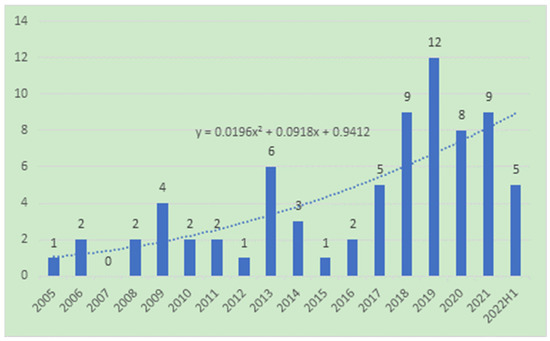 As shown in Figure 2, since 2005, the number of articles published annually has significantly increased, with a peak in 2019 (n = 12). Despite being established nearly 20 years ago, the research of CGCC is still growing rapidly. The results show that the number of academic studies on the CGCC topic has grown exponentially over the past five years (478% compared to the first 5 years): 58.1% of the studies were generated in the past 5 years. It also shows that CGCC research has expanded in scope and branch over time.