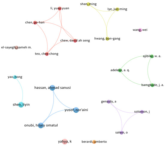 Figure 4 shows a collaboration network led by three eminent authors: Shen Liyin, Hong Kong Polytechnic University (HK); A. Genaidy, University of Cincinnati (USA); and J. Solomon, University of Cincinnati (USA). It is important to note that Figure 4 also shows scattered scholarly contributions by many authors who do not belong to any of the pre-existing clusters in the network. It is important to stress, however, that researchers can collaborate more closely in the future to make contributions to CGCC research.