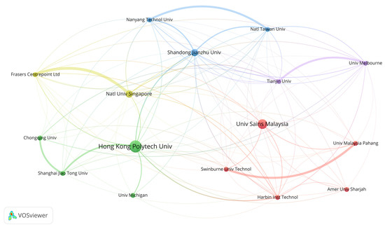 No institution published more than seven publications (10% of 74). Only two institutions (Hong Kong Polytech University and University Sains Malaysia, respectively) published four or more papers (5% of 74) and the studies were relatively independent. Therefore, it can be argued that no institution has led CGCC research to date. However, some of the institutions located in Asia and North America have a higher reputation in CGCC due to higher citations, including the Hong Kong Polytechnic University (Hong Kong, China, 548 citations), Shanghai Jiao Tong University (Shanghai, China, 260 citations), University Michigan (Michigan, USA, 225 citations), Nanyang Technological University (Singapore, 133 citations), and National Taiwan University (Taipei, China, 133 citations). In addition, Figure 6 illustrates the lack of inter-organizational collaboration in research.