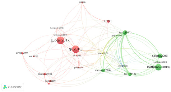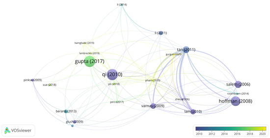 We perform the publications co-citation analysis to identify the most influential publications and build the co-citation network. As shown in Figure 7 and Figure 8, this study built a co-citation visual network graph containing 22 items, for which the minimum number of citations was set to 20 (one item was not connected to other items, so it was deleted). The nodes in the map represent documents identified by the first author and publication year. The publishing and co-citation dates are shown by the node and link colors, respectively. The literature in Figure 7 uses different colors to indicate the difference in its clustering, and the literature co-occurrence demonstrates “local concentration and overall dispersion”, indicating that a number of CGCC researchers were well-recognized and produced common ideas and results. The year 2010 was a watershed year for CGCC research, with many highly cited papers published around 2010. Co-citation data over time demonstrates the rapid growth in CGCC expertise.