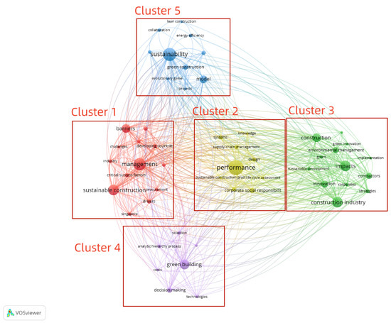 Furthermore, we can clearly see that current research was divided into five major research clusters in Figure 9, which are research cluster 1 “What affects the application of CGCC?”; research cluster 2 “What is the performance of CGCC?”; research cluster 3 “What is the further impact of CGCC?”; research cluster 4 “How does CGCC promote green building?”; and research cluster 5 “What is the relationship between CGCC and sustainability?”. The five major research clusters were subsequently discussed below.