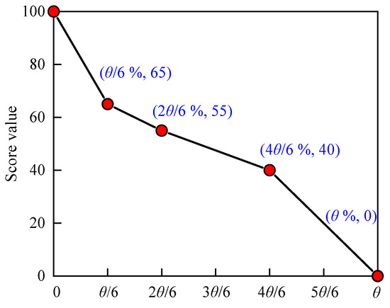 Assuming that there is only one variable in Equation (6), the cable force threshold (θ) can be obtained by substituting the deflection range of the girder. Then, referring to the component grading deduction standard of STCE 2011 [11], the five-level criteria for evaluating cable force variation rate are established in a piecewise linear manner, as shown in Figure 4.