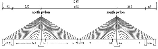 The Third Nanjing Yangtze River Bridge, a mega-span double-pylon, double-cable deck steel cable-stayed bridge in China, was taken as the engineering background bridge. The bridge is oriented north to south and measures 1288 m in length overall with a 648 m main span. The steel pylon and steel box are made of Q345D steel. A total of 168 stay cables, each made up of 109 to 241 wires with a diameter of 7 mm, support the deck. The stay cables adopt low-relaxation, ultra-high-strength galvanized steel wire, and the tensile strength of the steel wire is 1670 MPa. The bridge was opened to traffic in 2005. Figure 5 shows its elevation.
