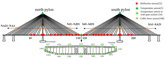 To ensure the safe operation of the bridge, a bridge structural health-monitoring system was installed. The main girder deflection monitoring was carried out by the closed connected pipe method with ROSEMOUNT 3051S sensors, which were arranged longitudinally in the side and middle spans of the bridge. Taking the upstream as an example, there are 22 effective measuring points (Figure 6). R.M.YOUNG-41372 temperature and humidity sensors (accuracy ±0.3 °C, ±2% RH, sampling frequency 10 Hz) from the USA were used to monitor the ambient temperature. The anchor load cell (ALC) sensors were installed in the anchors of stay cables that achieve measuring cable force directly. ALCs with a relative inaccuracy of 1% and an acquisition frequency of 10 Hz were installed in all 168 of the stay cables [12]. The specific distribution and quantity of monitoring sensors of the Third Nanjing Yangtze River Bridge are shown in Figure 6.