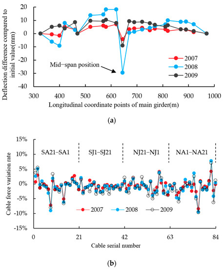 Three groups of deflection and cable force change from 2007 to 2009: (a) deflection difference compared to initial value; (b) cable force variation rate.