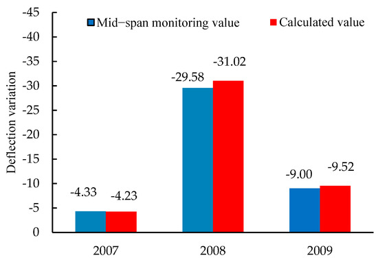 The bridge was relatively stable in the first few years of operation and can be used to verify the theoretical relationship established above, between cable force and girder deflection. To ensure similar monitoring time and temperature and relatively stable vehicle load, the monitoring data on 7 January 2007 at 1:00 am, 20 January 2008 at 1:00 am, and 15 January 2009 at 1:00 am were selected. Their temperatures were 3.12, 3.13, and 3.10 °C, respectively. Taking the monitoring data after the completion of the bridge in 2005 as the initial value, the deflection change value and cable force change rate of the girder in 2007, 2008, and 2009 were calculated, as shown in Figure 7. It can be seen that the deflection difference was about ±10 mm, and the maximum was −29.58 mm. The change rate of cable force was mostly within 5%, and the maximum was 10%. Overall, the structural change was relatively stable and can be regarded as a non-destructive state. Therefore, these three sets of monitoring data can be used to verify the theoretical relationship between girder deflection and cable force proposed in Section 2.1.