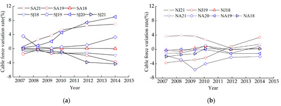 According to the previous analysis, the influence of a long cable on cable force is relatively large [28,29]. Therefore, the cable forces of 16 cables (No. 18–21) during the six closure periods were selected. In fact, due to the failure of two sensors, the cable forces of 14 cables were selected, namely SA21, SA19, SA18, SJ18, SJ19, SJ20, and SJ21 in the south pylon and NA21, NA19, NA18, NJ18, NJ19, NJ20, and NJ21 in the north pylon. The variation rate of cable force in each period was obtained by comparing these cable forces with the initial cable forces (Figure 9). We can see that the long cable forces of the south pylon vary greatly; some of them increase or decrease year by year, some of them remain basically unchanged, and the maximum change rate is about 8%. In addition, the long cable force of the north pylon changes slightly, with a change of about 4%.