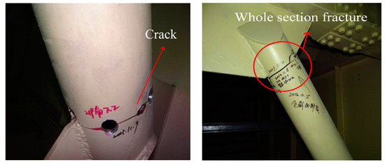 The data in Table 3 show the trend of cable force degradation. According to the classification of technical conditions in STCE2011 (Table 1) [11], the cable force belonged to level 2 from 2007 to 2013. Although the condition level of grouped cable forces remains the same, the assessment result, the uniform assessment score, and the non-uniform coefficient all show a downward trend. Moreover, it can be predicted that the score of the grouped cables will probably be lower than 80 after 2014, entering level 3, which needs repair maintenance or rehabilitation. The Annual Bridge Inspection Report shows that there is no damage to the internal and external of stay cables and the anchor connection, while there are more cracks at the welding hole of the inclined web member in the steel box girder (see Figure 10), which may be the cause of the cable force changes. The total length of cracks in each box chamber section of the steel box girder was counted, and the crack distribution diagram of the steel box girder was obtained, as shown in Figure 11. It can be seen that the number and length of cracks increased year by year from 2010 to 2014, which indicates that cracks in the steel box girder are becoming more and more serious. In terms of the longitudinal distribution of the main girder, there are fewer cracks near the two main pylons, but more cracks are distributed near the quarter point of the midspan and the auxiliary pier. This will lead to uneven stress of the main girder, which will cause the fluctuation of cable forces, and then lead to poor evaluation results of grouped cable forces.