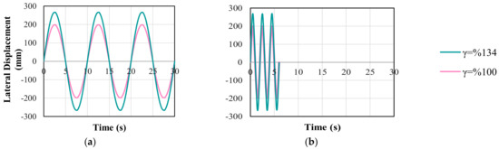 During the tests, three cycles of sinusoidal motion were applied to the LRB, as shown in Figure 3a,b for loading frequencies of 0.1 and 0.5 Hz, respectively. The vertical force acting on the LRB during the cyclic motion was 3177 kN, corresponding to a normal stress of 5.8 MPa.
