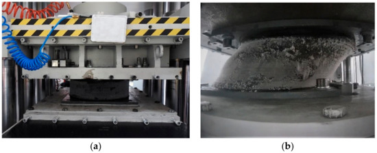 For −20 °C, 24 h exposure time loading combination (a) LRB placed in the seismic isolator test device (b) a view from cyclic motion.