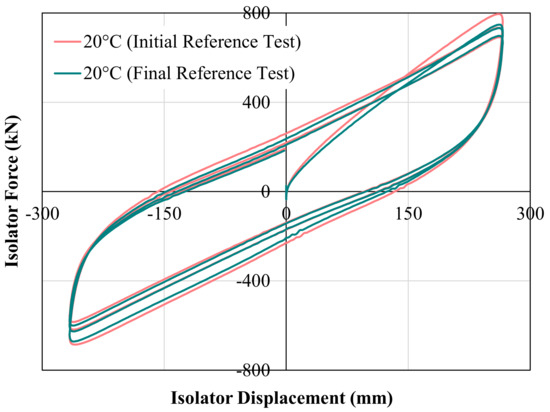 During the tests, force-displacement curves of the full-size LRB were recorded for each loading combination given in Table 1. In this section, recorded hysteretic curves will be presented comparatively. However, first, in order to ensure that there is no permanent deformation on the LRB after all the loading sequences, pictures of the LRB both before the initial loading and after the final loading cases are given in Figure 5. In addition, as shown in Figure 6, having almost identical reference force-displacement curves reveals that the cyclic response of the LRB remains almost the same after the testing campaign is completed. Thus, testing the same LRB at all loading cases defined in Table 1 did not introduce any bias.