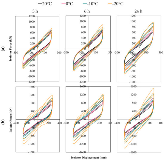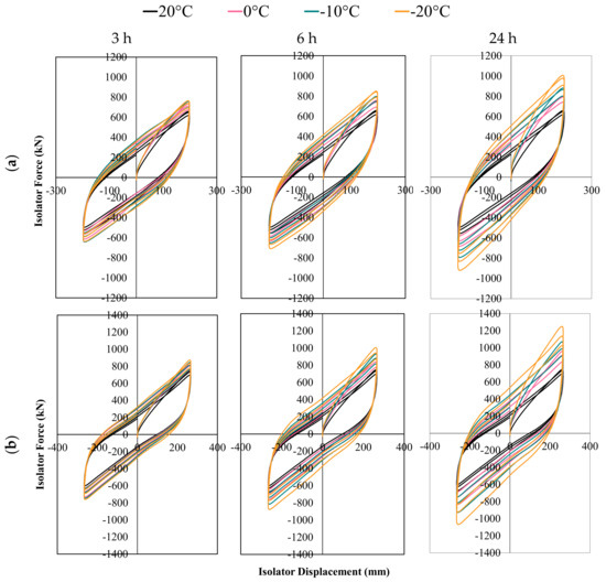 Figure 7 and Figure 8 depict force-displacement curves recorded under different loading combinations defined as functions of shear strain, ambient temperature, and exposure time to low temperature. It is clear that both the strength and lateral stiffness of the LRB tend to increase regardless of the loading frequency when the ambient temperature decreases. Another observation is that the hysteretic behavior of the LRB is sensitive to exposure time at low temperatures.