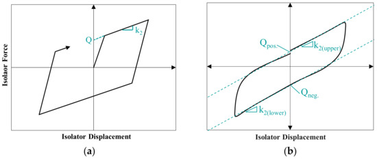 In order to reveal the trend of change in isolator mechanical properties better, characteristic strength, Q, and post-elastic stiffness, k2 (see Figure 9a for definitions) of the LRB were obtained using recorded force-displacement curves. Q and k2 are calculated by the straight-line fit method suggested by EN-15129 [22]. In this study, the Least Square Method (LSM) is used to find the best fit for data by minimizing the sum of the squared errors. In Figure 9b, the application of LSM is described for a representative force-displacement curve. Accordingly, (Qpos and Qneg) and (k2(upper) and k2(lower)) values are acquired for each cycle of the motion as defined in Figure 9b. Then, the ultimate Q and k2 values are computed by Equations (1) and (2), respectively. Table 2 and Table 3 present the corresponding isolator characteristics calculated for different loading cases.