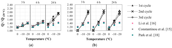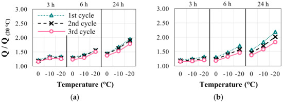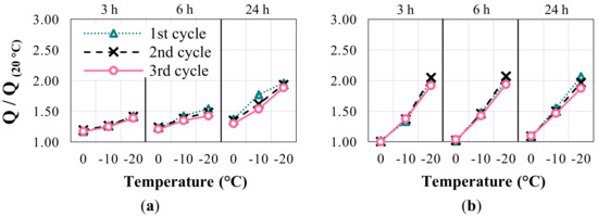 In Figure 10, it is also observed that the amplification in LRB strength tends to decrease with the increasing number of loading cycles. Such observation can be ascribed to the temperature rises at the lead core of LRB during cyclic motion. Kalpakidis et al. [23] revealed that the strength of an LRB deteriorates during cyclic motion as a function of the lead core heating. The temperature rise at the lead core will result in a thermal transient, and the corresponding temperature of the lead core at each loading cycle will increase gradually. For instance, for the loading case where the temperature is −20 °C and exposure time is 24 h, the lead core temperature will be close to −20 °C at the 1st cycle. However, because of the temperature rise at the lead core, it will be greater than −20 °C in the 2nd and 3rd cycles. Accordingly, the amplifications in the strength of LRB with respect to the reference case will decrease with the increasing number of cycles. Apart from Figure 10, in Figure 11, the change in Q/Q(20 °C) ratios from cycle-to-cycle are very limited, especially for 134% shear strain. For data presented in Figure 11, the loading velocity is five times larger than the one in Figure 10. In the 0.5 Hz loading frequency case, the maximum loading velocities were 622 and 835 mm/s for 100 and 134% shear strains, respectively. In addition, the temperature rise in the lead core will be much higher compared to loading cases having 0.1 Hz frequency. As a result, the gradual deterioration in the strength of LRB will be higher at each cycle and has a very close trend with the deterioration in the reference test (see Figure 12). Thus, the corresponding amplifications in the strength of LRB (or Q/Q(20 °C) ratios) at each loading cycle attain almost identical values, as presented in Figure 11.