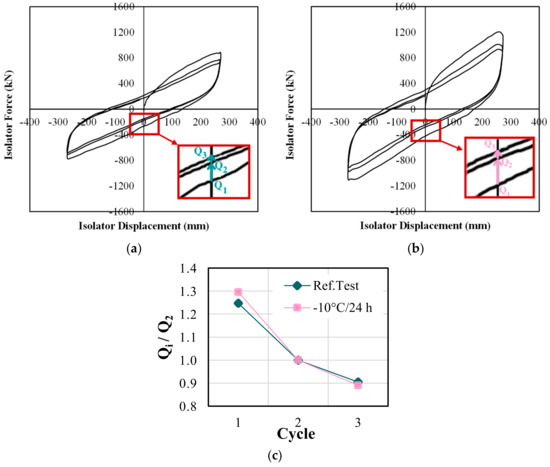 Force-displacement curves of the LRB for 134% shear strain and 0.5 Hz loading frequency (a) reference test (b) 24 h exposure time at −10 °C, (c) ratio of characteristic strength each cycle to that of the second cycle.