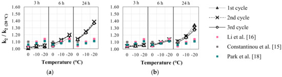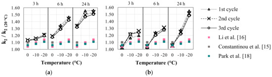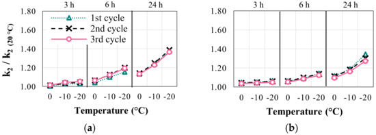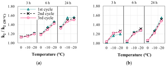 Figure 13 and Figure 14 show the amplifications in post-yield stiffness of the LRB for different temperatures and exposure times. Post-yield stiffnesses computed for each temperature and exposure time are normalized with the ones calculated for 20 °C, k2/k2(20 °C). Similarly, Figure 13 and Figure 14 indicate that k2/k2(20 °C) ratios increase with decreasing temperature and increasing exposure time. However, the amplifications in post-yield stiffness are less than those computed for characteristic strength. Furthermore, k2/k2(20 °C) ratios are almost not sensitive to changes in lead core temperature during the cyclic motion and remain the same at all cycles. It is because the thermal conductivity of rubber (0.16 W/mK) is very low compared to lead (35.3 W/mK). Hence, the temperature rise in the lead core does not change the temperature of the rubber layers during the test. Such observation is also parallel to the findings of Kalpakidis et al. [23]. It is also noted that amplifications in post-yield stiffness due to low-temperature exposure are higher for loadings with 0.5 Hz frequency compared to those with 0.1 Hz frequency.