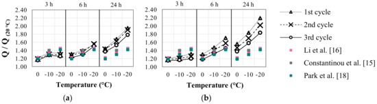 In the literature, there are studies that proposed modification factors to estimate the variation in mechanical properties of LRBs exposed to low temperatures. In this section, three of those studies (see Table 4) are cited to evaluate their accuracy in estimating the amplifications in both characteristic strength and post-yield stiffness. The reason for considering the proposals of Constantinou et al. [15], Li et al. [16], and Park et al. [18] is that they were conducted with large-size LRBs having similar dimensions to the LRB tested in this research study. Table 4 presents the amplification factors suggested for both characteristic strength and post-yield stiffness. Figure 15, Figure 16, Figure 17 and Figure 18 are depicted to compare the experimentally calculated amplifications of the current study with the proposals of the studies cited above. Figure 15 and Figure 16 present the comparisons for characteristic strength, Q, for loading frequencies of 0.1 and 0.5 Hz, respectively. In these figures, for 100% shear strain, it is clear that regardless of the loading frequency, the proposals given in Table 4 are consistent with the test results for all of the considered temperatures when the exposure time is 3 and 6 h. However, for an exposure time of 24 h, proposed amplification factors underestimate the computed ones, and the degree of underestimation increases with decreasing temperature. When the shear strain is 134%, the loading frequency seems to affect the accuracy of the proposed factors. For 0.1 Hz frequency, they provide close estimations for 3 and 6 h of exposure times. However, their estimations do not represent actual behavior when the exposure time is 24 h for all of the considered temperatures. For 0.5 Hz frequency, cited proposals lead to close or overestimated amplifications for −10 and 0 °C while they underestimate the amplification in Q for all of the exposure times at −20 °C. Figure 15 and Figure 16 revealed that the existing proposals for estimation of the amplification in characteristic strength of LRB need to be improved to consider the effects of both exposure time and loading frequency.