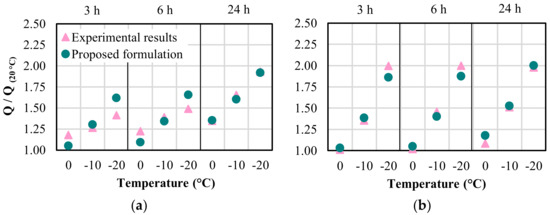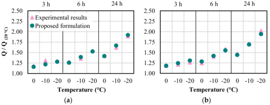 In Table 2 and Table 3, the results obtained for 20 °C are considered reference values. In order to have clear observations in terms of amplification in mechanical properties of the tested LRB at low temperatures (−20 °C, −10 °C, and 0 °C), experimental data were normalized with the ones obtained from the reference tests. Accordingly, Figure 10 and Figure 11 illustrate the normalized characteristic strength Q/Q(20 °C) at ambient temperatures of −20, −10, and 0 °C for 0.1 and 0.5 Hz loading frequencies, respectively. Figure 10 and Figure 11 clearly show that the characteristic strength, Q, of the LRB increases with decreasing temperature. The amount of increase becomes more pronounced with longer exposure times at all temperatures. It is apparent that the time of exposure to low temperatures has a significant impact on the amplification of the LRB strength.