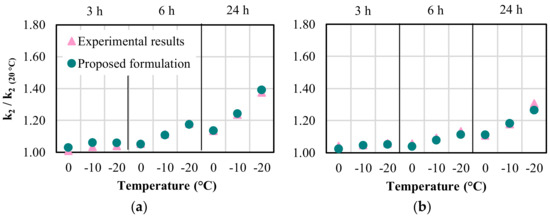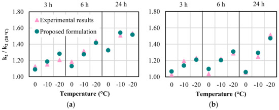 Figure 17 and Figure 18 compare the estimations of amplification factors given in Table 4 with experimental data in terms of post-yield stiffness, k2. Figure 17 presents very similar results to the ones for characteristic strength. Amplification factors of Table 4 give very close estimations for all temperatures when the exposure time is 3 and 6 h. On the other hand, they underestimate experimental data for 24 h exposure time. In Figure 18, where the loading frequency is 0.5 Hz, the amplifications in post-yield stiffness are underestimated for almost all of the temperatures and exposure times. Furthermore, the amount of underestimation tends to increase with decreasing temperature and increasing exposure time. Such observations clearly indicate that the cited proposals used to estimate amplification in post-yield stiffness of LRBs also do not cover the effects of exposure time and loading frequency.