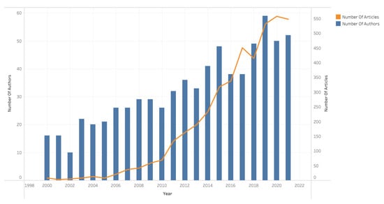 As can be seen from Figure 2, the variation trend of the number of authors is consistent with the variation law of the number of published articles. We can see from Figure 2 that, between 2010 and 2021, the number of scholars studying zero-energy buildings has increased.