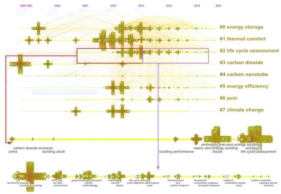 When analyzing the frequency of keywords, we set the CiteSpace (5.8.R3 SE 64-bit) parameter settings as follows: Time span Period to 2021, the Time Slice as a Time partition every year, the analysis object as the keyword and the filtering criteria of the analysis object as the TOP50. The Pathfinder algorithm was used to trim the graph and run to obtain eight clusters of keywords, including energy storage, thermal comfort, life-cycle assessment, carbon dioxide levels, carbon nanotube, energy efficiency, PCM and climate change. Furthermore, this study used the cluster number as the Y-axis and the publication year as the X-axis, and finally obtained the time axis visualization of the keyword co-occurrence network (Figure 4).