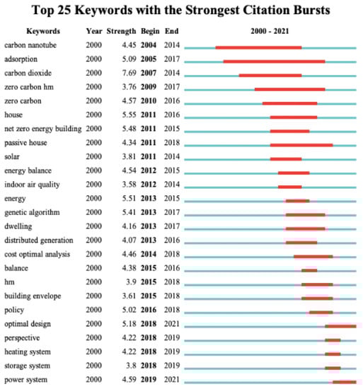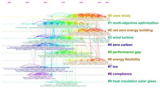 For instance, a number of important study findings in the area of carbon dioxide emissions were published between 2000 and 2007 with keywords such as climate, systems and climate change. The definition of a zero-energy building in its infancy only refers to the energy used in the building’s operation, ignoring the energy use aspects related to the building’s construction and delivery, as well as the energy use of the building’s components. In contrast, the concept of “net zero energy building”, which is used in the field of ecological economics, considers the energy used in the production of building materials and is widely used in fields such as agriculture and transportation. In addition, from Figure 4, we can see that the keyword node of cluster #2 life-cycle assessment shows that, in 2006, the carbon emission levels of building stock in China began to be considered a problem. In 2011, a number of zero-energy buildings appeared in the field, and resarchers began to make a connection between the life-cycle of buildings and zero-energy buildings. From 2012 to 2021, the impact of the carbon footprint on the life-cycle of buildings was noticed, and further research has been conducted to develop zero-energy buildings.