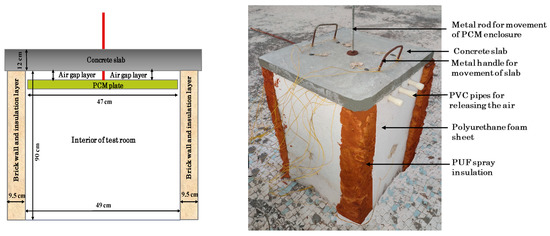 The field test was carried out during March and April 2020 using unconditioned single-room test buildings (68 cm × 68 cm × 102 cm) located on the terrace. The test room building is shown in Figure 1. The lightweight fly ash bricks (24 cm × 11 cm × 7 cm) are used to build the test room walls while the conventional concrete slab with a thickness of 12 cm is used as a roof of a building. The outer walls, except for the roof of the room, are insulated by a polyurethane foam (PUF) sheet of a thickness of 3 cm and PUF insulation spray on all the corners of the walls to ensure perfect insulation condition for studying the effect of heat transfer through the roof.