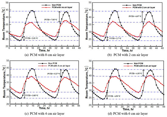 The impact of diurnal variation in room temperature for different configurations within the study, namely no- PCM and PCM with 0, 2, 4, and 6 cm air layer thickness, is investigated.