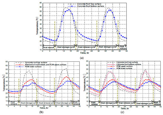 The temperature distribution is studied based on temperatures of different surfaces like rooftop surface, roof bottom surface, PCM upper surface, and PCM lower surface. In Figure 3a–e, the heat storage cycle is established for the diurnal period (7.00 hr in the morning to 20.00 hr in the evening). The heat release cycle is established, on the other hand, during the night hours, i.e., from 19.00 to 24.00 hr and 1.00 to 7.00 hr. During the heat storage cycle, for the two days test cycle, the PCM configuration with no air layer, rooftop surface, interface surface, and PCM lower surface acquires the average maximum temperature of 54.89, 44.03, and 38.88 °C, respectively. In contrast, the average minimum temperature attained during the heat release cycle is 19.88, 25.14, and 27.25 °C, respectively. For other configurations, i.e., PCM with 2, 4, and 6 cm air layer, average maximum and minimum temperatures attained by different surfaces during the heat storage and heat release cycle can be obtained from Figure 3. The time lag, decrement factor, and heat gain are obtained from roof temperature distribution based on the hourly variation in surface temperature and its hourly span. The MKR index is obtained using Equation (5) for different configurations and is tabulated in Table 2.