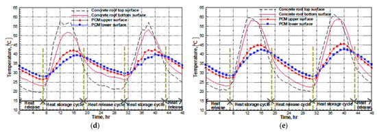 Temperature distribution across the roof slab. (a) Non-PCM; (b) PCM with 0 cm air layer; (c) PCM with 2 cm air layer; (d) PCM with 4 cm air layer; (e) PCM with 6 cm air layer.