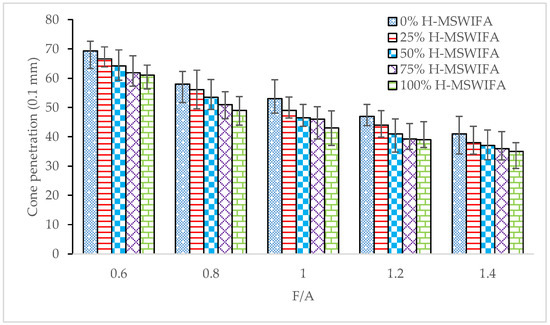 Figure 2 shows that, for asphalt mastics with the same H-MSWIFA replacement ratios, the greater the F/A, the smaller the cone penetration of the asphalt mastic, Taking the cone penetration of asphalt mastic with a F/A of 0.6 as the reference value, under the same H-MSWIFA replacement ratio, when the F/A is 0.8, 1.0, 1.2, and 1.4, the cone penetration of the asphalt mastic is about 80~85%, 10~76%, 63~68%, and 57~59% of the reference value. The cone penetration of asphalt mastics with different H-MSWIFA replacement ratios is gradually reduced with the gradual increase in replacing ratio, but the decrease is relatively small compared with the F/A. Taking the H-MSWIFA replacement ratio of 0% as the reference value, when the F/A is 0.6, the cone penetration of the asphalt mastics with the H-MSWIFA replacement ratio of 25%, 50%, 75%, and 100% is 96%, 93%, 89% and 88% of the reference value respectively. When the F/A is 0.8, this ratio is 96%, 92%, 88%, and 84% respectively. When the F/A is 1.0/1.2/1.4, this ratio is 92%/94%/93%, 88%/87%/90%, 87%/83%/88%, and 81%/82%/85% respectively. It can be seen that the viscosity of the asphalt mastic is improved after H-MSWIFA replaces some of the mineral powder, which is related to the smaller particle size and larger pH value of H-MSWIFA.
