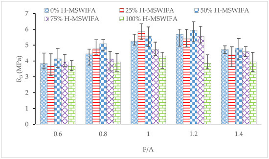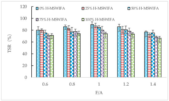 The MS’ and TSR are both evaluation indicators of the water stability of asphalt mixtures. It can be seen from Figure 14 and Figure 15 that the F/A and the H-MSWIFA replacement ratio have a certain impact on the test results. Specifically, when the H-MSWIFA replacement ratio is fixed, MS’ and TSR first increase and then decrease rapidly with the increase in F/A and reach a maximum near a F/A of 1.0. When F/A is fixed, MS’ and TSR gradually decrease with the increase in the H-MSWIFA replacement ratio. This phenomenon shows that the water stability of the asphalt mixture can be significantly affected by the F/A and the H-MSWIFA replacement ratio. The specific performance is that the water stability reaches the best value when F/A is around 1.0, and the addition of H-MSWIFA can harm water stability. From the perspective of water stability, the H-MSWIFA replacement ratio should not be too high.