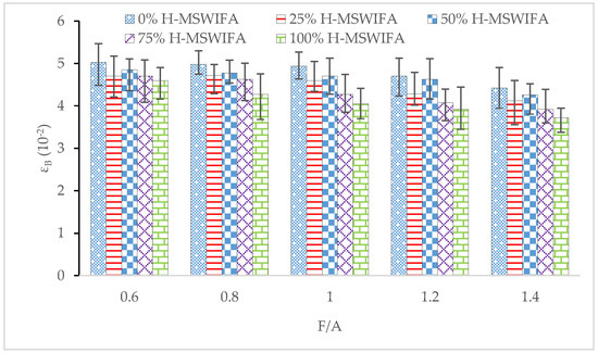 εB as an evaluation index of low-temperature crack resistance of asphalt mixtures, the larger the value, the stronger the low-temperature crack resistance of the asphalt mixture. It can be seen from Figure 16 that the F/A and the H-MSWIFA replacement ratio have a certain impact on the test results. Specifically, when the H-MSWIFA replacement ratio is fixed, εB decreases rapidly with the increase in F/A, and when F/A is fixed, the value of εB also shows a decreasing trend with the increase in the H-MSWIFA replacement ratio. This phenomenon shows that both the F/A and H-MSWIFA replacement ratio can significantly affect the low-temperature anti-cracking performance of the asphalt mixture. The higher the F/A, the worse the low-temperature anti-cracking performance of the asphalt mixture. At the same time, the addition of H-MSWIFA harms low-temperature anti-cracking performance. From the perspective of low-temperature anti-cracking performance, the H-MSWIFA replacement ratio should not be too high.