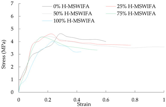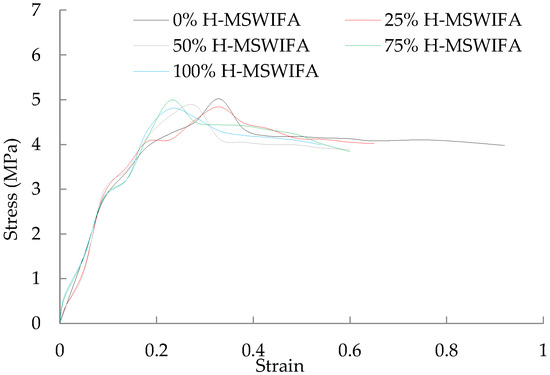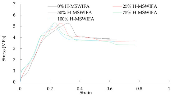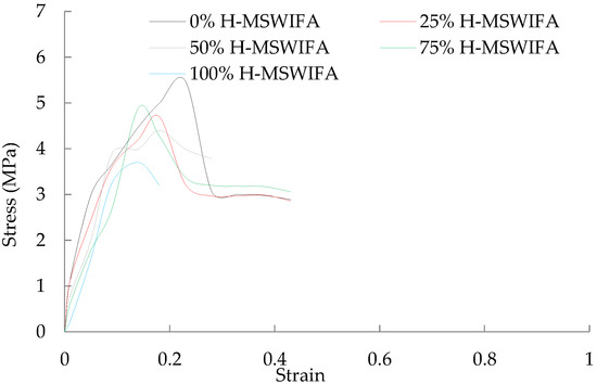 Figure 7, Figure 8, Figure 9, Figure 10 and Figure 11 show that during the FSFE, the stress-strain curves of asphalt mastics under different working conditions are similar, and the stress gradually increases with the increase in strain. After reaching the maximum stress value, the stress decreases rapidly until fracture with the continuous increase in strain. The specific performances of the full-section fracture test curves of asphalt mastics with different H-MSWIFA replacement ratios differ. When F/A is fixed, the maximum stress value of asphalt mastic during the test gradually decreases with the gradual increase in the H-MSWIFA replacement ratio, or the strain corresponding to the maximum stress decreases when the maximum stress value is similar. The calculation results of the FSFE of each specimen are summarized in Table 6.