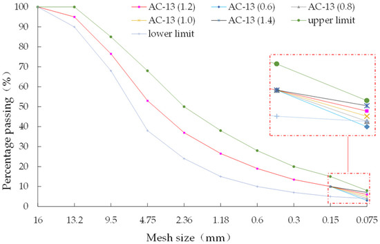 AC-13 with different F/A and different H-MSWIFA replacement ratios were prepared with SBS I-C, H-MSWIFA, mineral powder, and basalt aggregate. Then the DS, εB, MS’, and TSR were tested to evaluate the high-temperature stability, low-temperature cracking resistance, and water stability of the H-MSWIFA asphalt mixture, respectively. In this paper, the Marshall volume design method is used to design the asphalt mixtures. The test of DS adopts a 300 mm × 300 mm × 50 mm test piece formed by the wheel rolling method, with a wheel width of 300 mm and a compaction line load of 300 N/cm. At 155 °C, the test piece can be made after 4 times preloading and then 24 times rolling. The prepared test piece can be cut after cooling to obtain the specified 250 mm × 30 mm × 35 mm small beam for εB, and the loading rate during the test is 50 mm/min. The test pieces used by TSR and MS’ are Marshall test pieces, with a diameter of 106.6 mm and a height of 63.5 mm. They are made by lifting a flat circular indenter with a diameter of 98.5 mm to a height of 457.2 mm, and free-falling compaction. The test piece for the TSR test is obtained by 50 repeats of double-sided compaction, while the test piece for the MS’ test is obtained by 75 repeats of double-sided compaction. In order to avoid interference from the gradation to the test results, the gradation of AC-13 is unified in this paper, as shown in Figure 12. Considering the influence of the F/A, the asphalt-aggregate ratio is fixed at 5.0%. Partial mix design data of the H-MSWIFA asphalt mixture are shown in Table 7, and the measurement method of the volume parameters is the water weight method.