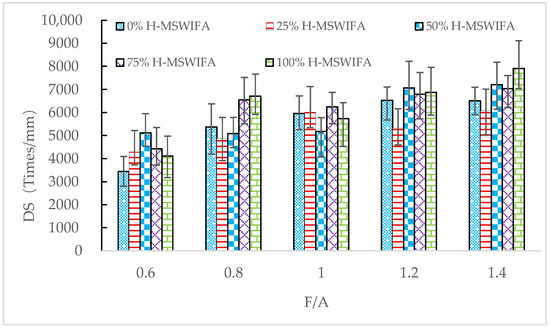 The rutting test of AC-13 with different F/A and different H-MSWIFA replacement ratios was carried out to obtain the DS. The test results are summarized in Figure 13.