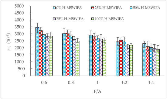 Low-temperature bending tests of AC-13 with different F/A and different H-MSWIFA replacement ratios were carried out to obtain the εB. The test results are summarized in Figure 16.