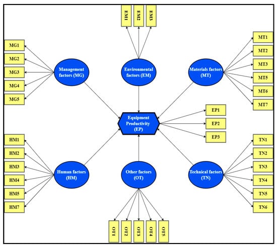 SEM consists of two parts: an estimation model and a primary model. As mentioned in the preceding section, the factor investigation provides the estimation model, considering how effectively the identified parameters (exogenous variables) estimate latent factors [33,35]. Model optimization can be accomplished through the elimination of weakly connected linkages or by eliminating attributes with weak relationships to their latent parameters [28,36,37,38,39]. The equipment size (MT4) and the personal problems of equipment operators/workers (HM6) were two attributes that had weak correlations with their latent components. These two attributes had factor loadings below 0.40, as mentioned in the previous section. Therefore, they were removed as part of the model modification. Figure 3 shows how the factors that affect construction equipment productivity were modified.
