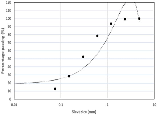 The physical properties of the materials are given in Table 1, and the particle size distribution of the filler material is presented in Figure 1. The chemical composition of RM, FA, GGBS, and AL were analysed using the X-ray fluorescence (XRF) method, and the results are presented in Table 2, Table 3, Table 4 and Table 5. The chemical composition of the red mud varied slightly compared to the red mud utilized by Prasetyoko et al. and Panwar et al. [32,33]. The content of iron oxide present in the red mud was 54.26%, slightly more than that of the values presented by other researchers. A similar variation was observed in the chemical composition of the other materials. The chemical composition of the fly ash is presented in Table 3. The results were compared with the fly ash used by Nordin et al., (2016) and Rafieeizonooz et al., (2021) [34,35]. The fly ash used in the present research was rich in alumina when compared to the other fly ashes. At the same time, the silica content was low. The chemical composition of the GGBS and AL was determined and the results are presented in Table 4 and Table 5. The slag used by Pfingsten et al., (2018), Hammad et al., (2021), Sagar et al., (2020) and, Panda et al., (2020) [36,37,38,39] were compared with the GGBS and AL used in this investigation. The calcium oxide in our materials was low compared to the other studies.