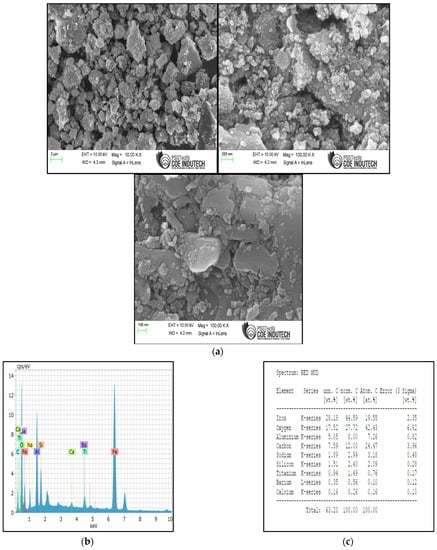 (a) Field emission scanning electron microscopy images of sustainable red mud brick. (b,c) Energy dispersive X-ray analysis of sustainable red mud brick.