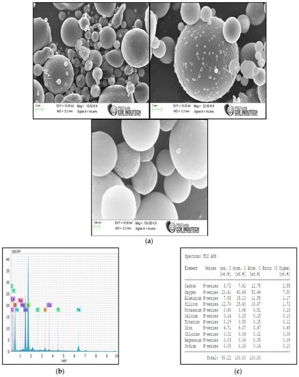 (a) Field emission scanning electron microscope images of fly ash. (b,c) Energy dispersive X-ray analysis images of fly ash.