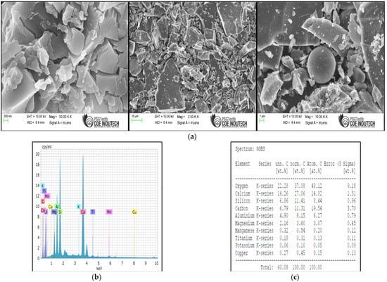 (a) Field emission scanning electron microscope images of alccofine. (b,c) Energy dispersive X-ray analysis of alccofine.