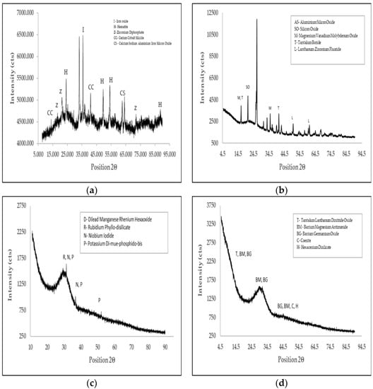 (a) X-ray diffraction pattern of red mud sample. (b) X-ray diffraction pattern of fly ash sample. (c) X-ray diffraction pattern of ground granulated blast furnace slag sample. (d) X-ray diffraction pattern of alccofine sample.