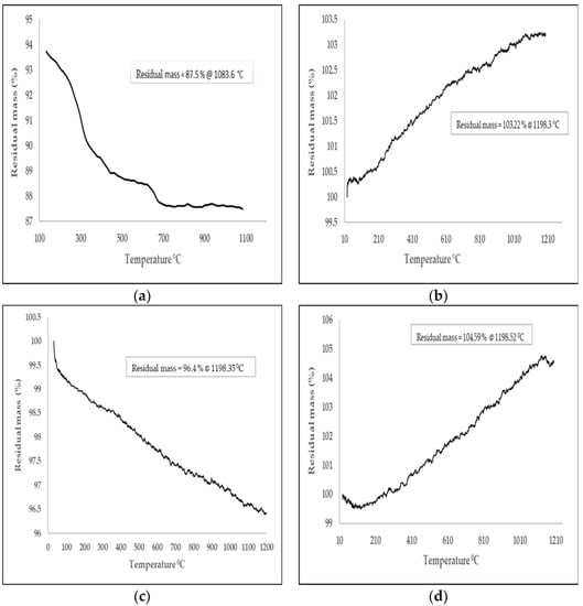 (a) Thermogravimetric analysis of red mud sample. (b) Thermogravimetric analysis of fly ash sample. (c) Thermogravimetric analysis of ground granulated blast furnace slag sample. (d) Thermogravimetric analysis of alccofine sample.