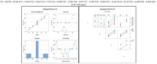 The optimization was fixed by using the Minitab 20.1.1 tool. The regression equation was generated by the general linear model of the variable of the mix proportions with the experimentally identified compressive strength using the factor coding method (−1, 0, +1). The compressive strength is denoted by X1 and the residuals RM, FA, GGBS and AL are indicated as Y1, Y2, Y3 and Y4. The equation of regression for X1 was generated by the general linear regression method given below, where the values were interpreted from Table 8, and the coefficients of linear regression and regression statistics are given in Table 9. The value of R2 was 0.994, which is highly acceptable. The regression analysis results using ANOVA (analysis of variance) are shown in Table 8. The values mentioned in Table 8 show the relationship among the variables, where the coefficient of determination R2 is evaluated. In this formulation, Y3 and Y4 are not considered as the major parts as Y1 and Y2 are. Y11 + Y12 + … are the terms of the coefficients as given in Table 8. The residual plots and the interaction plots based on X1 are shown in Figure 8.