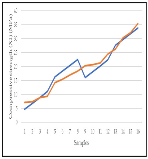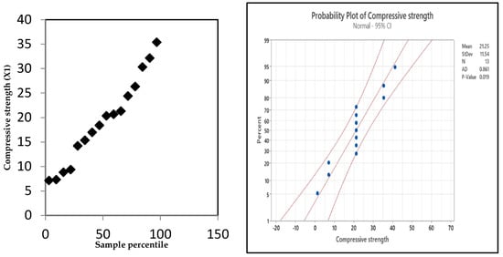The factorial design (Table 10) was analysed by the Plackett–Burman (PB) method and was found to be significant where the p-value was less than 0.05 as mentioned in Table 8. By identifying the critical variables, the probability output and predicted values for the compressive strength X1 are given in Table 11. From the results of the Table, sample number 16 pertaining to group D achieved a higher percentile which indicates the optimal proportions. From the various mix proportions, the ratio of filler to fine materials was 2:1, and two parts of filler were added for every one part of fines. The mix proportions of the fines were determined as RM:FA:GGBS:AL 9:8:2:1 (parts by weight). The fine material was proportioned as nine parts of red mud with eight parts fly ash, two parts ground granulated blast furnace slag and one part alccofine. The alkali activators, sodium silicate solution and 4 M sodium hydroxide solution were mixed in the ratio of 2.5:1 by volume. The sodium silicate solution contained undissolved silicon dioxide (SiO2) nanoparticles, which induces additional intra-atomic bonding by increasing the viscosity of the liquid phase, which binds the particles together. Thus, the mixture was prepared 24–36 h before the addition of the dry ingredients. The said ingredients were blended well with the alkali-activated solution, which was transferred through a conveyor belt and fed into the feeder box. The mixture was compressed into bricks using a hydraulic ram, with a pressure of 15 MPa for the respective standard shape and size (228 mm × 108 mm × 80 mm) with sharp edges and corners. The SRMBs were then left for curing at ambient temperature for a minimum three days to a maximum of twenty-eight days. SRMB abidance adhered to the code provision prescribed by the Indian Standard Institution (IS 1077:1992) and [IS 3495 (Part 1 to Part 3)] [42,43,44,45]. The quality check of the brick, such as tests for compressive strength, flexure strength, split tensile, water absorption, initial water absorption, alternate wetting and drying and efflorescence was performed on the initial age day, i.e., the 3rd day from the date of casting the bricks; hence, the process was optimized after day 28 of curing until 90 days from casting. The curing was only done at ambient temperature (nearly 22 °C to 35 °C).
