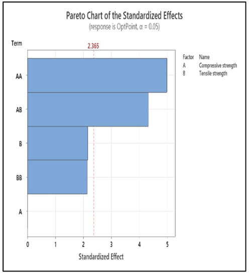 Figure 9 shows the graphical representation of the probability and predicted output showing some similarities in small variations. The normal probability plot based on the resulting compressive strength is represented in Figure 10. The optimal point from the response surface regression results is listed in Table 12 and Figure 11, where A represents compressive strength and B represents tensile strength and the Pareto chart for the resulting compressive and tensile strengths is given in thirteen runs. From the above observations, the optimum value from the analysis and experimental set-up was identified as sample D4 with mix R45F40G10A05 after twenty-eight days of ambient curing.