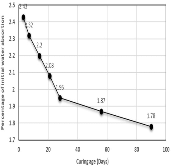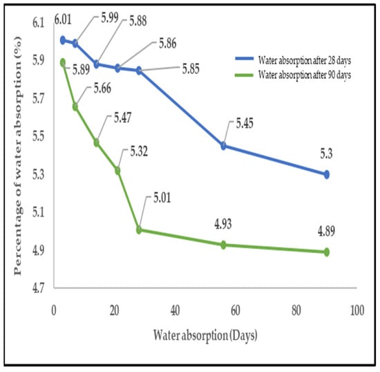 Variation in water absorption of SRMBs after 28 and 90 days of curing.
