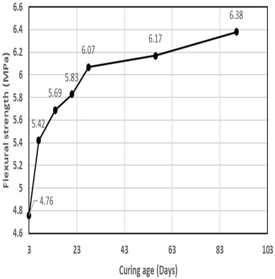 The flexural strength of the brick specimen was measured and calculated according to IS 4860:1968 [46], and the results are represented graphically in Figure 17. The graph depicts the flexural strength of the optimized mix for the specimen from the 3rd to the 90th day. The average flexural strength was determined from a minimum of five samples, and the results showed an increase in flexural strength with increasing curing age. The flexural strength was achieved on the third day of specimen curing. The flexural test set-up and the failure of flexural strength is shown in Figure 18. The image depicts the common type of failure seen in all the samples. The SRMBs had an excellent flexural strength of 6.07 MPa on the 28th day and 6.38 MPa on the 90th day, conforming to the Indian code specifications (IS 4860:1968) [46]. In addition, the compressive strength and the flexural strength had similar rapid increases up to 28 days and a gradual decrease until 90 days into the curing period.